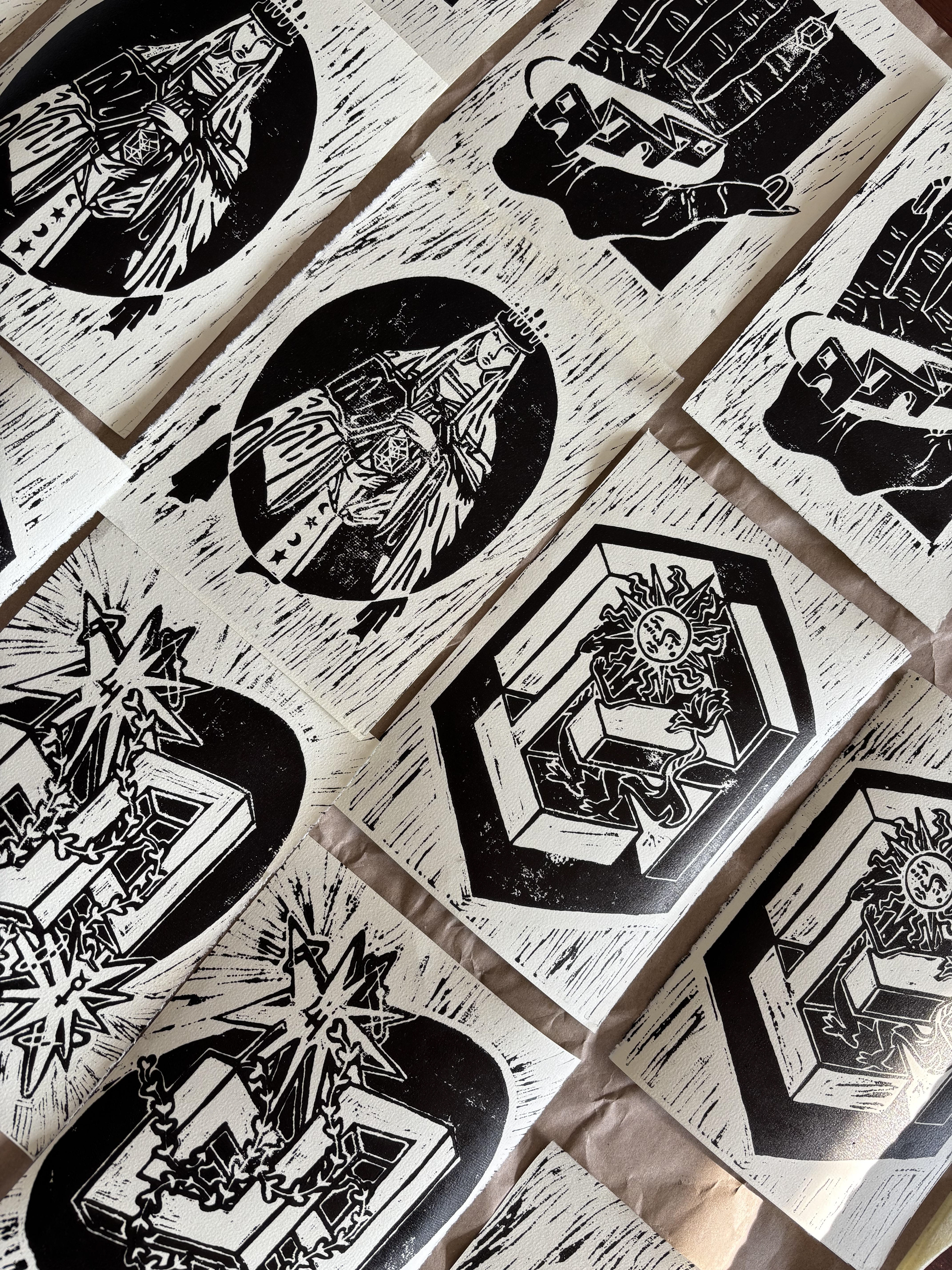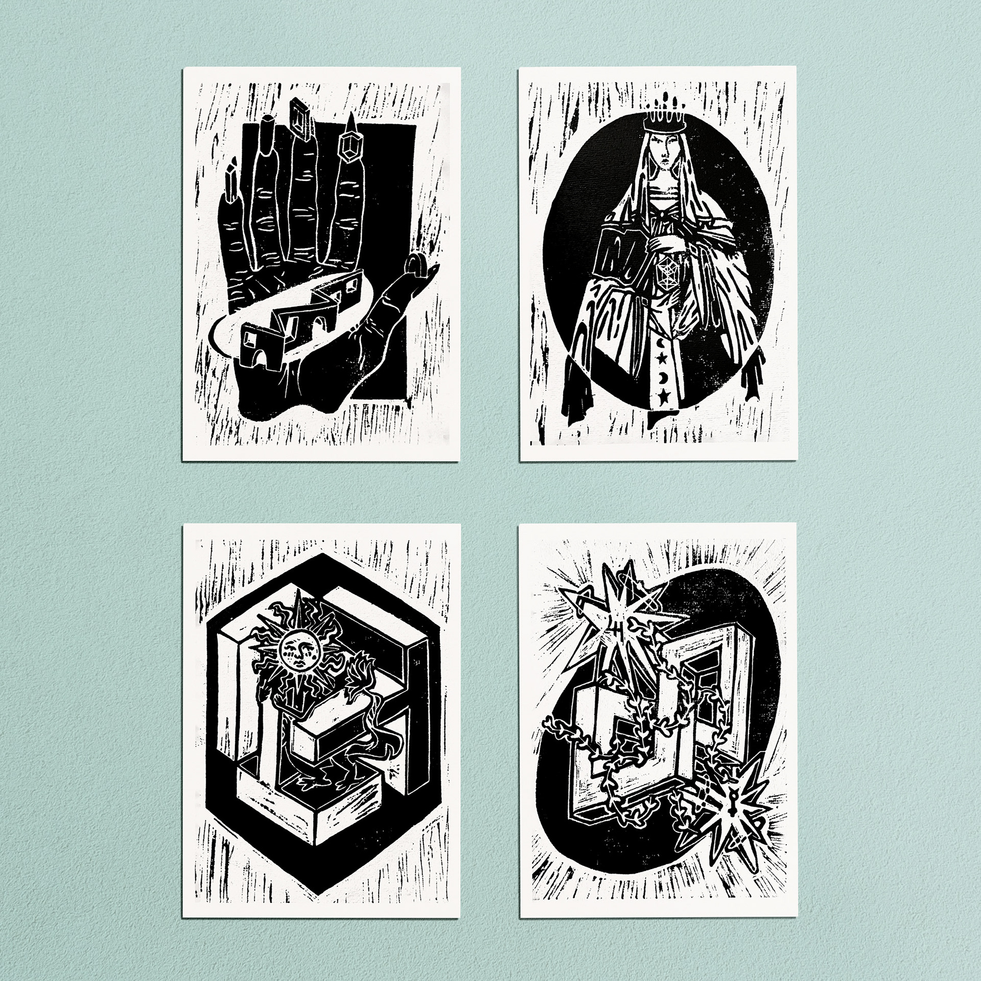 These four linocut prints ave the result of sketches and research into alchemical symbols.