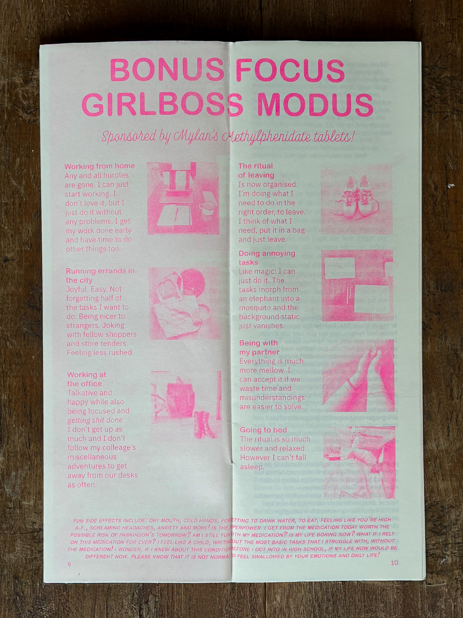 My contribution focussed on taking ADHD medication for the first time and recording the before and after of certain rituals of my day. All of this is done in the aesthetic of early 2000’s teen magazines.