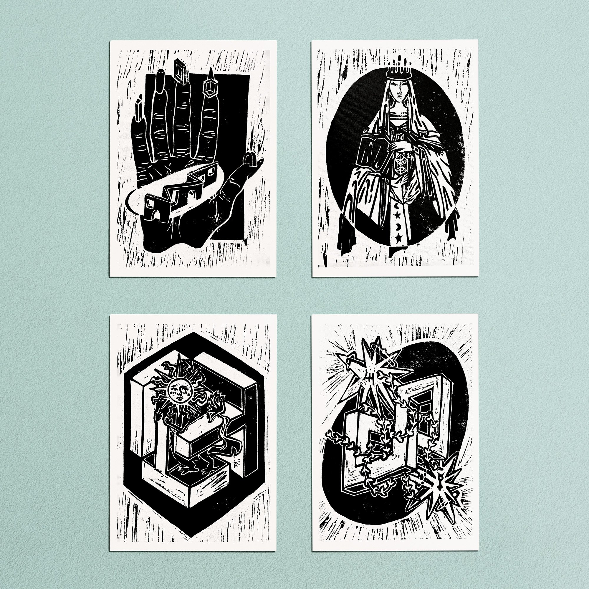 De linosneden zijn het resultaat van schetsen en onderzoek, waarbij ook elementen uit de alchemie zijn verwerkt. Deze symboliek werd toegevoegd vanuit nieuwsgierigheid en spel en fungeert als een verbindende laag tussen de verschillende thema’s. Alchemie, met haar focus op transformatie, sluit aan bij het samensmelten van ogenschijnlijk tegengestelde werelden.