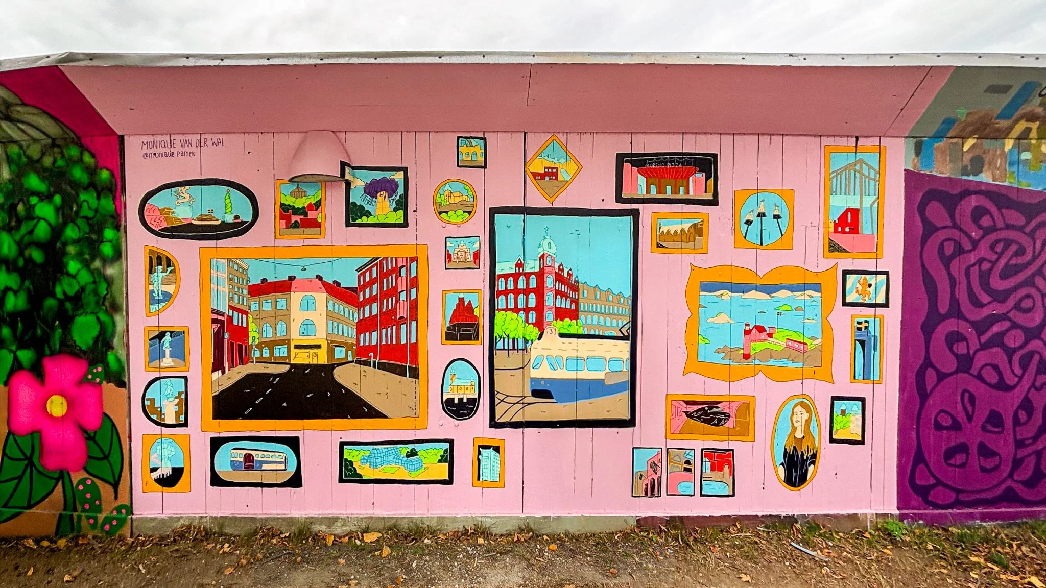 Dit project had al langere tijd mijn aandacht. Omdat ik zelf twee jaar in Gothenburg heb gestudeerd, voelde de stad al als een vertrouwde plek. Toen ik ontdekte dat Planksidan ook internationaal werd opengesteld, heb ik me direct aangemeld. Voor de muurschildering gebruikte ik beelden uit mijn eigen studietijd als uitgangspunt. Deze herinneringen zijn in het beeld letterlijk ingelijst en vormen samen een serie persoonlijke stadsgezichten.